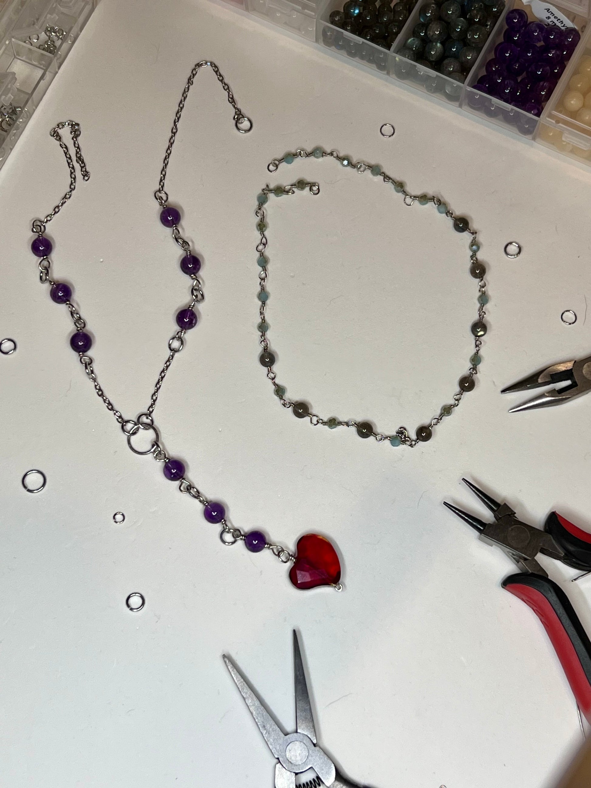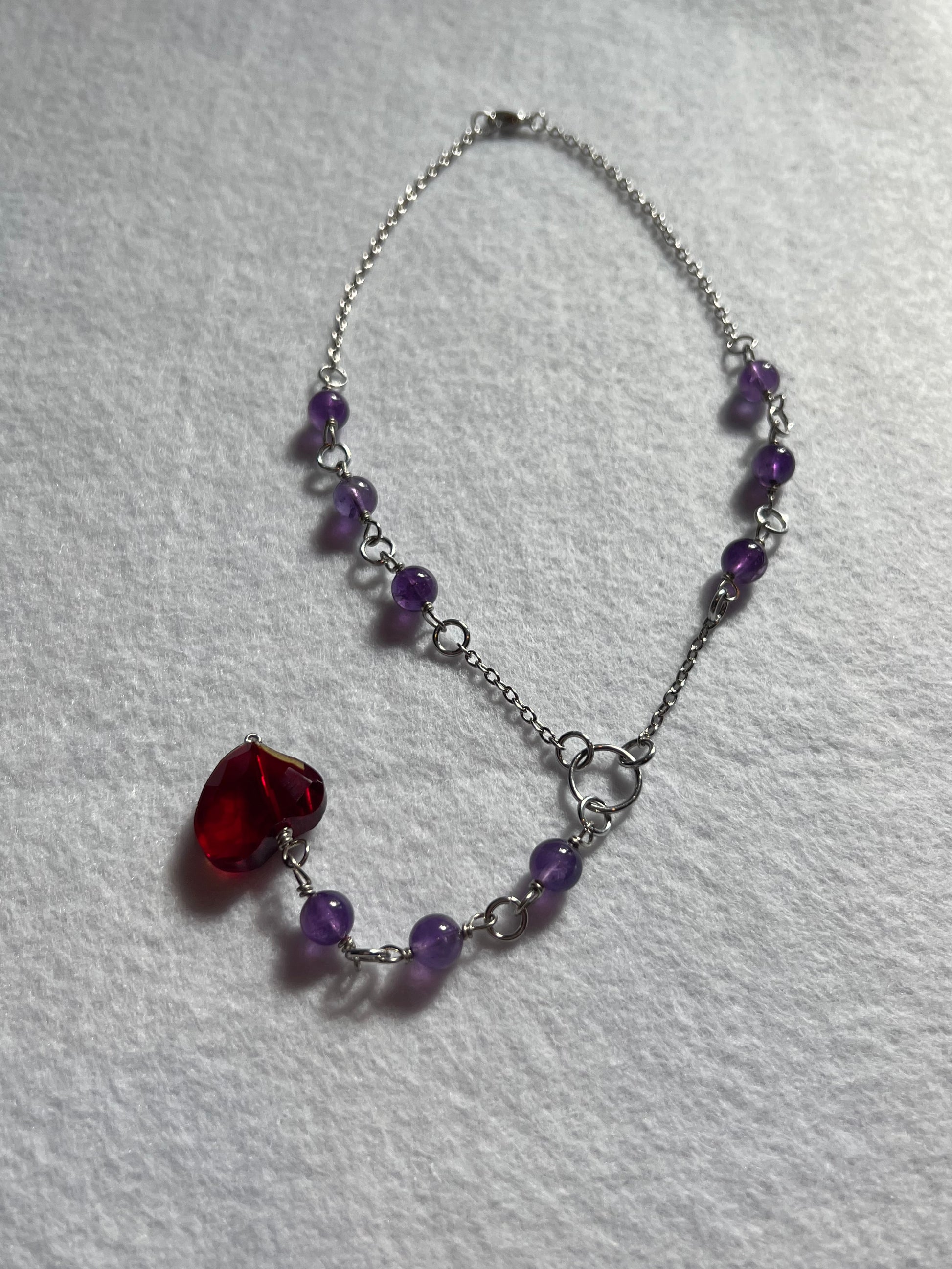 Handcrafted Falling Heart Necklace with Amethyst Gemstones and a red heart glass bead <3