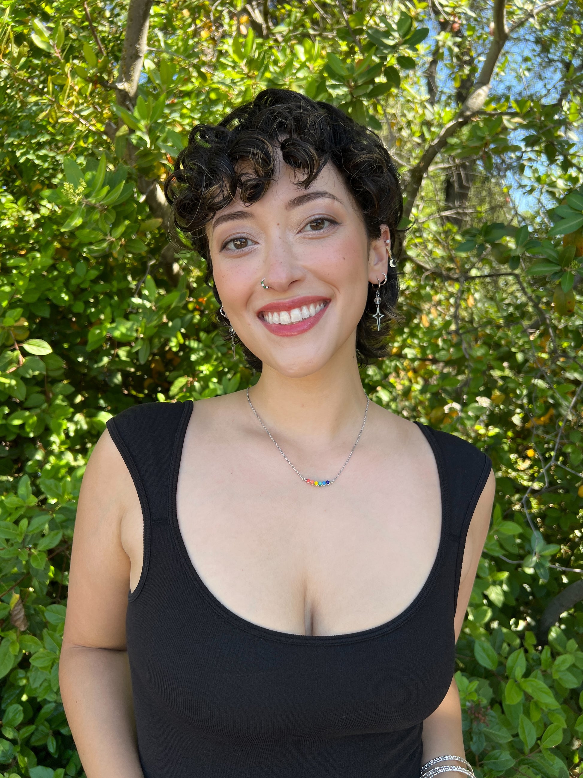 Wire-wrapped rainbow glass beads on a dainty 18k stainless-steel chain. Handmade with [lesbian] love <3